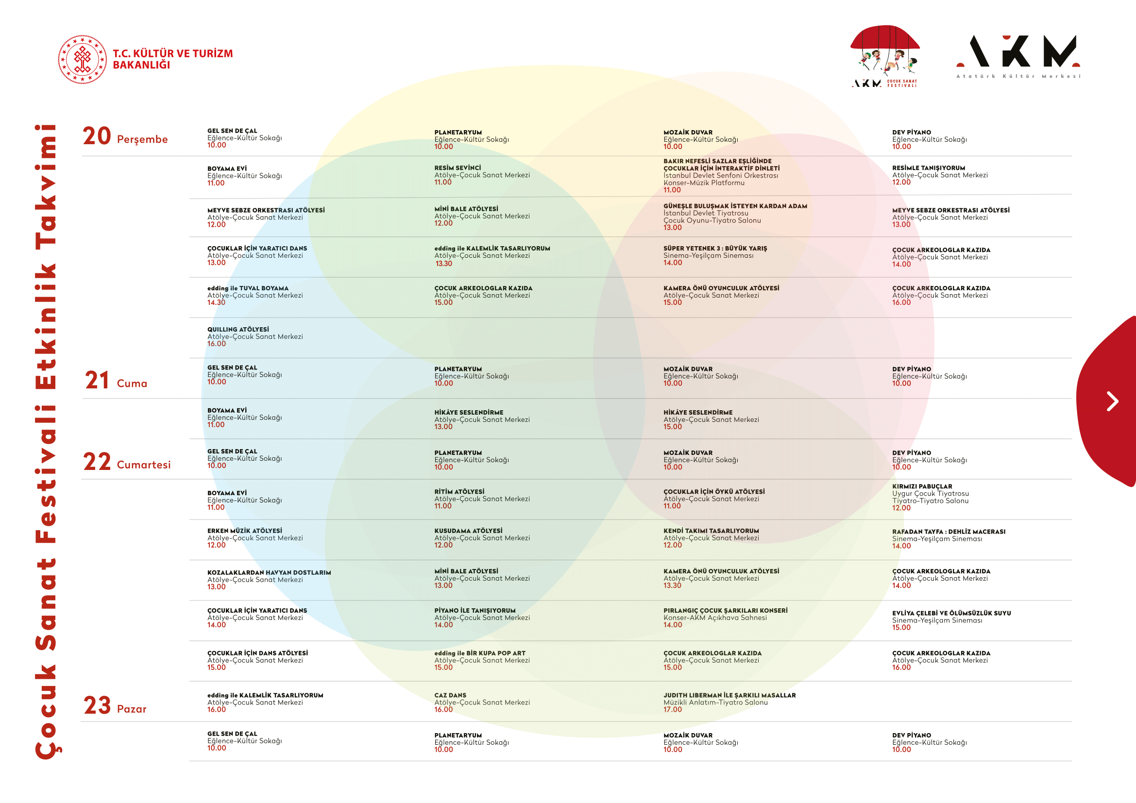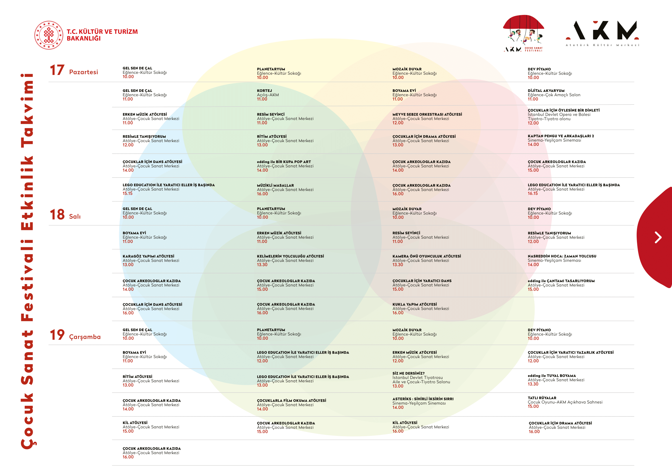 Festival kapsamında birçok yaratıcı etkinlik küçük sanatseverlerle buluşacak. Çocuklar, her yeri boyanan büyük bir evi kendi hayal dünyalarına göre renklendirebilecek, Çok Amaçlı Salonda kağıtlara çizdikleri balıkların birkaç dakika içinde yüzmeye başladığı etkileşimli bir akvaryum macerasına atılabilecek, AKM Çocuk Sanat Merkezinde gerçekleşecek farklı atölyelere katılabilecek. Bu atölyeler arasında 'Kelimelerin Yolculuğu', 'Çocuk Arkeologlar Kazıda', 'Yaratıcı Yazarlık', 'Lego Education ile Yaratıcı Eller İş Başında', 'Karagöz Yapım Atölyesi', 'edding ile Çantamı Tasarlıyorum' gibi birbirinden ilgi çekici etkinlikler bulunuyor. Bu etkinliklerin yanı sıra oyunculuk, film okuma, marakas yapımı, takı tasarımı, porselen kupa boyama, tuval boyama, kukla yapımı, meyve ve sebze orkestrası, quilling, resim, ritim, caz dans, bale ve müzik atölyeleri çocuklara hem eğlenceli hem de öğretici bir deneyim sunacak. Festival kapsamında Yeşilçam Sinemasında da 'Kaptan Pengu ve Arkadaşları 2', 'Nasreddin Hoca: Zaman Yolcusu', 'Asteriks: Sihirli İksirin Sırrı', 'Rafadan Tayfa: Dehliz Macerası' gibi çeşitli çizgi film gösterimleri çocuklarla buluşacak.