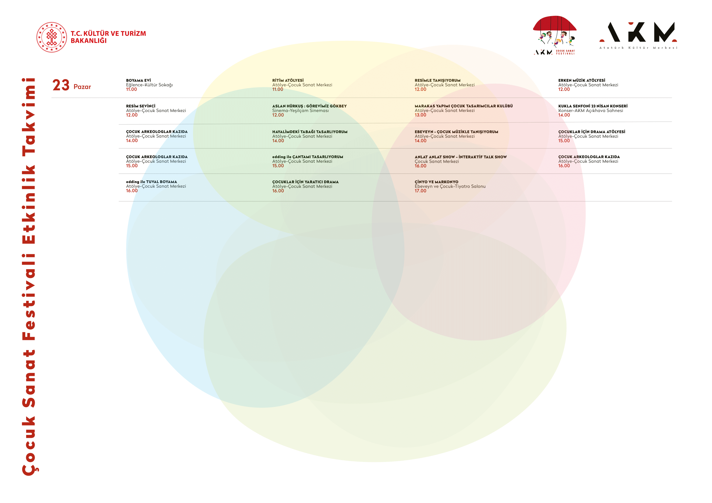 Çocukların öğrenirken eğlendiği birbirinden farklı birçok kültür sanat etkinliğine ev sahipliği yapan AKM, 23 Nisan haftasında da çocukların yanında! AKM'de 17 Nisan'da başlayacak ve 23 Nisan'a kadar sürecek Çocuk Sanat Festivali, bir hafta boyunca farklı etkinlikler, atölyeler, tiyatro oyunları, çizgi film gösterimleri ve animasyonlarla çocukları sanatın büyülü dünyasında benzersiz bir yolculuğa çıkaracak.